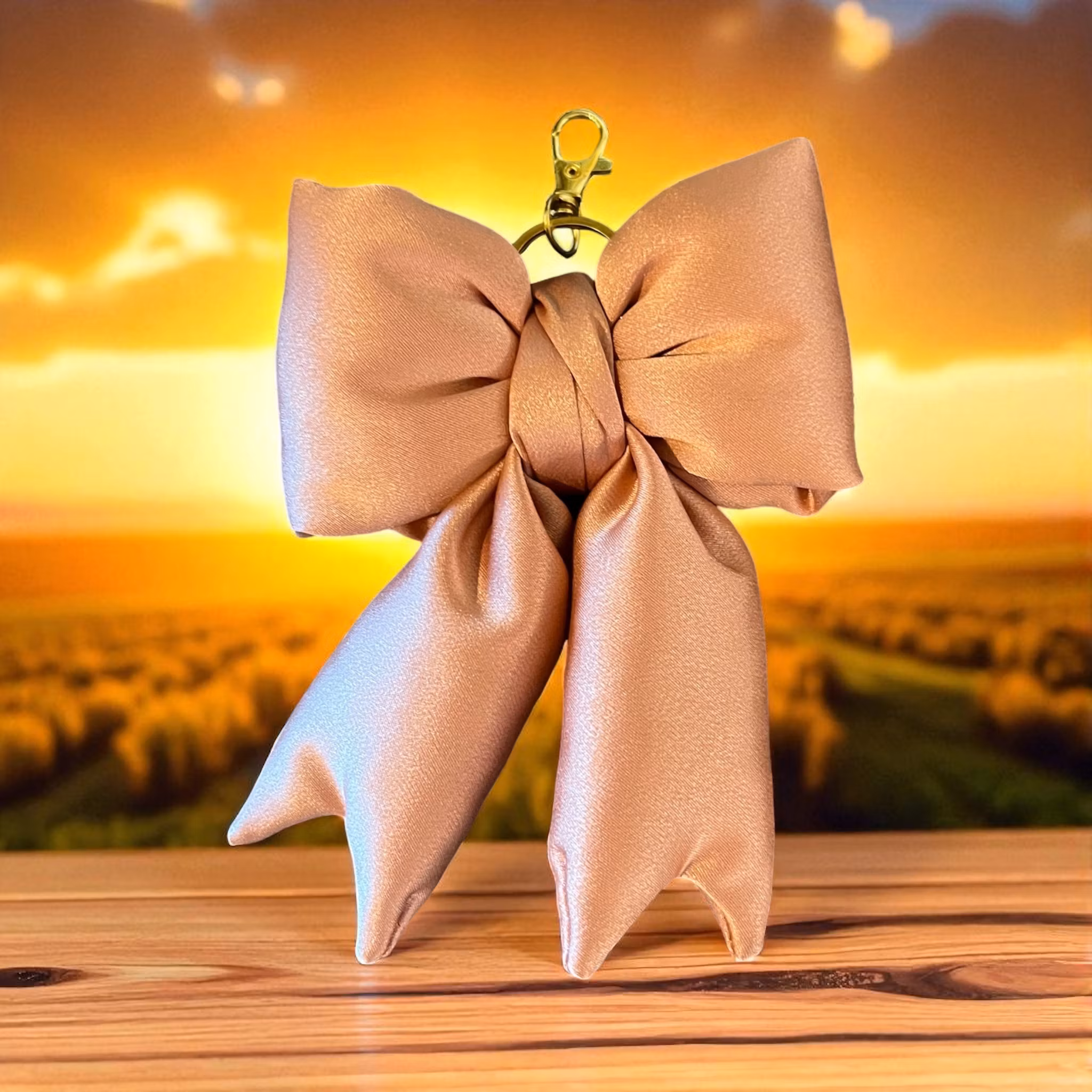 Fluffig rosett i guldorange micro satin. 14 x 11 cm. med guldfärgad nyckelring och karbinhake