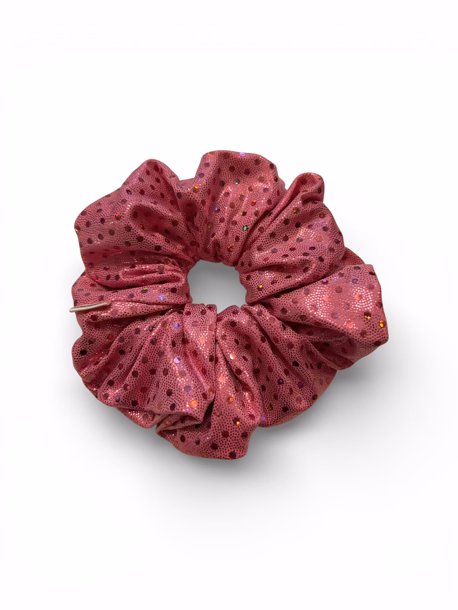 Scrunchy i härligt rosa tyg med guldfärgade prickar/paljetter. 14 cm i diameter.