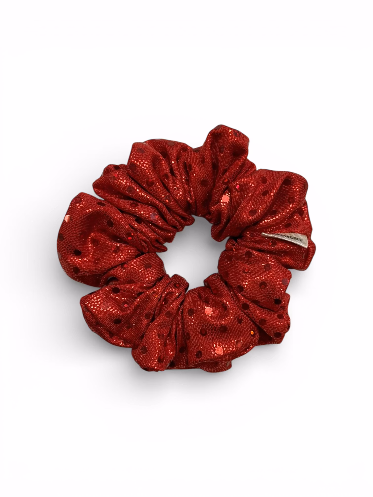 Scrunchy i härligt läppstiftsrött tyg med guldfärgade prickar/paljetter 8cm i diameter.