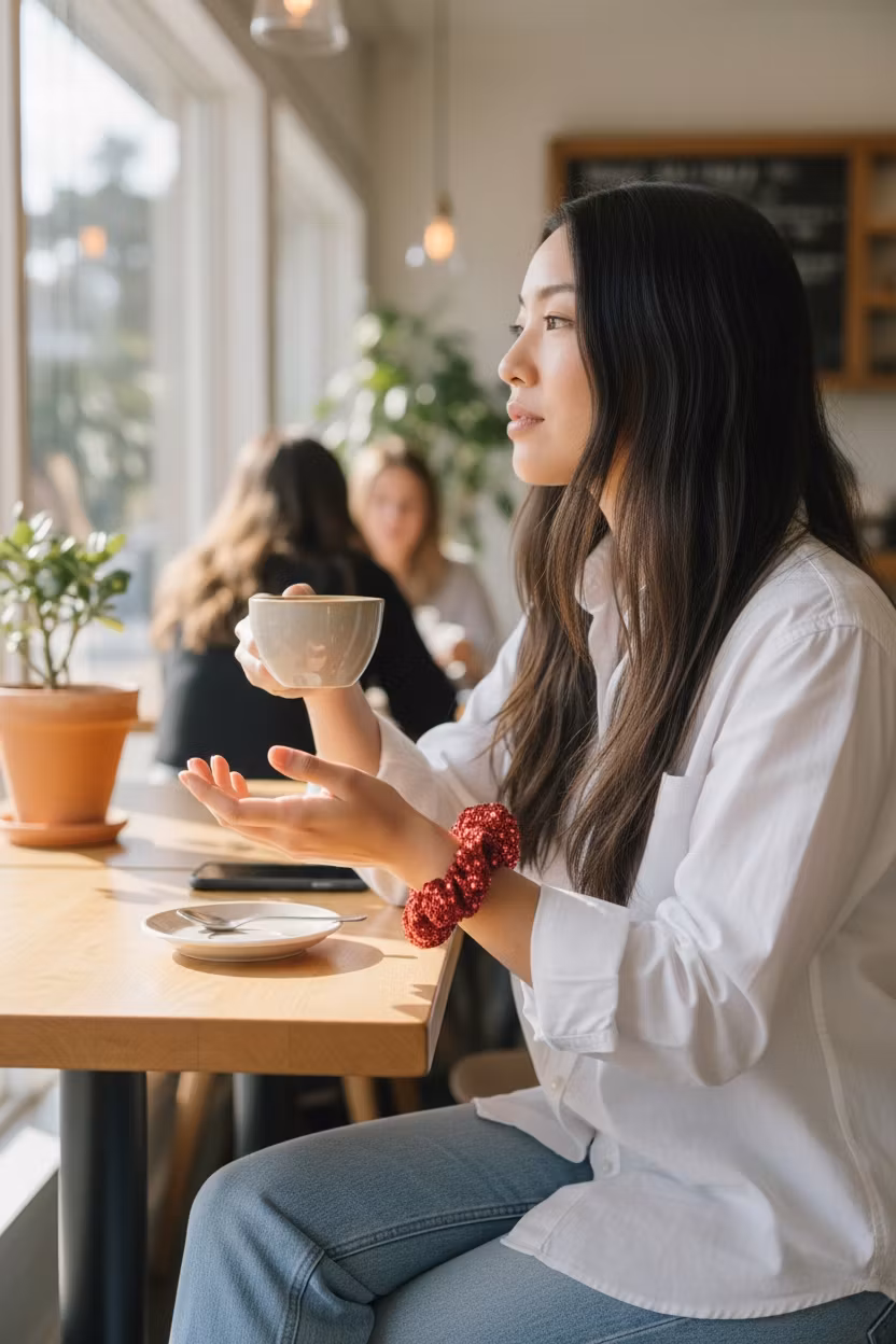 Scrunchy i härligt läppstiftsrött tyg med guldfärgade prickar/paljetter 8cm i diameter.👩🦱Snäll mot ditt hår🙋♀️Du kan ha den som armband💝Perfekta presenten👚Mac