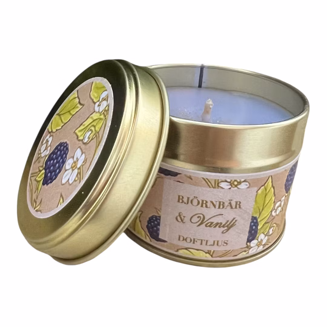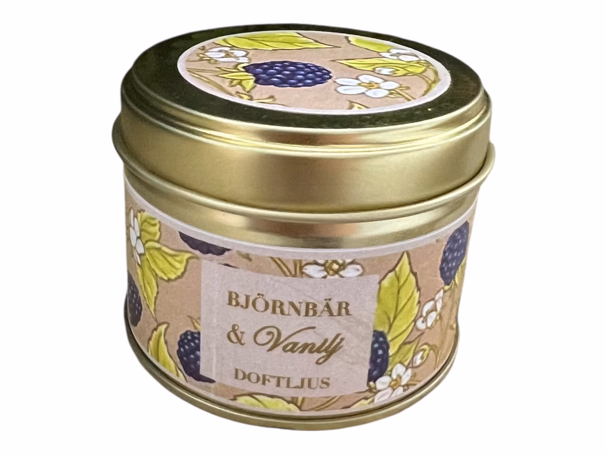Doftljus av sojavax. Doft av björnbär och vanilj. levereras i söt guldfärgad burk. 70 gram