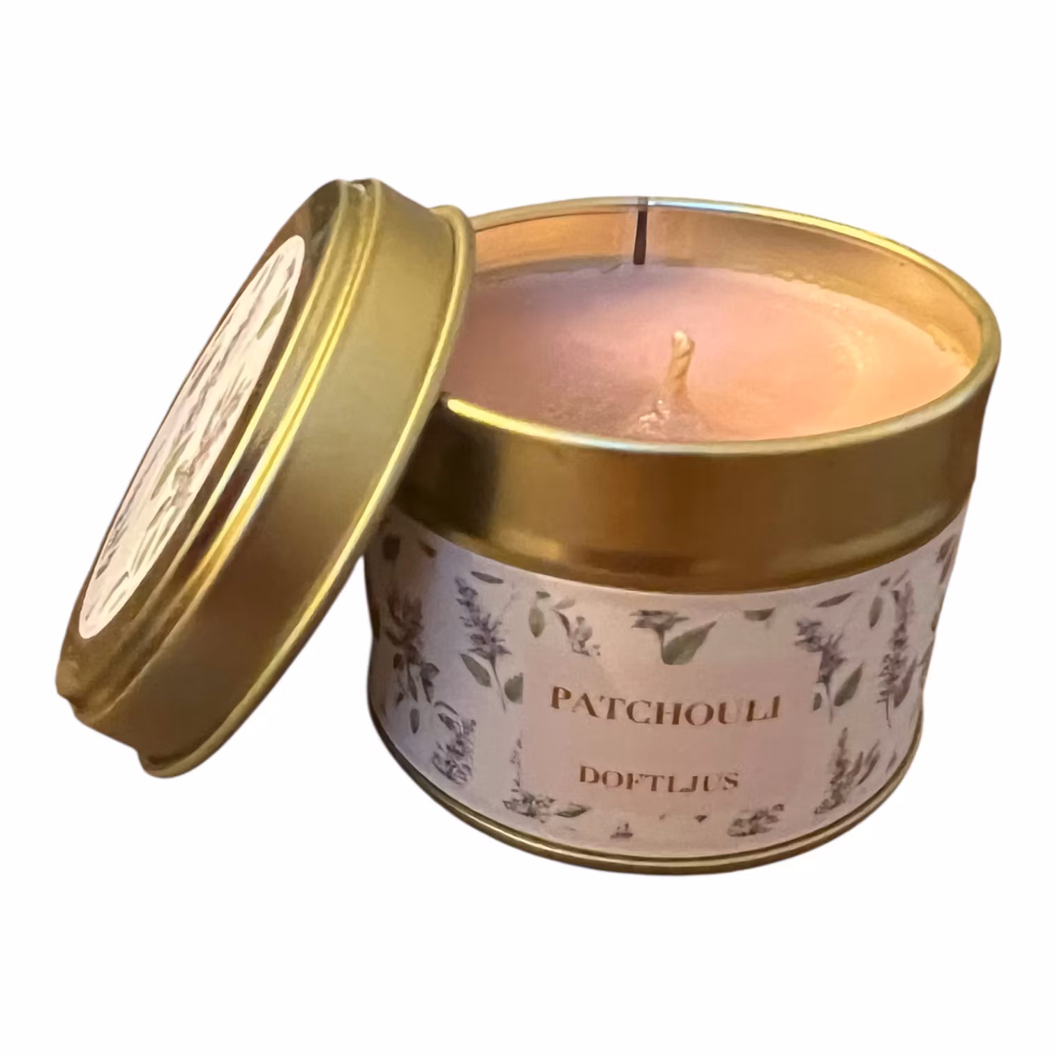 ljuvlig doft av Patchouli. Ljuset är av sojavax och dekorerad med glitter som följer med ljuset hela vägen ner till sista droppen.