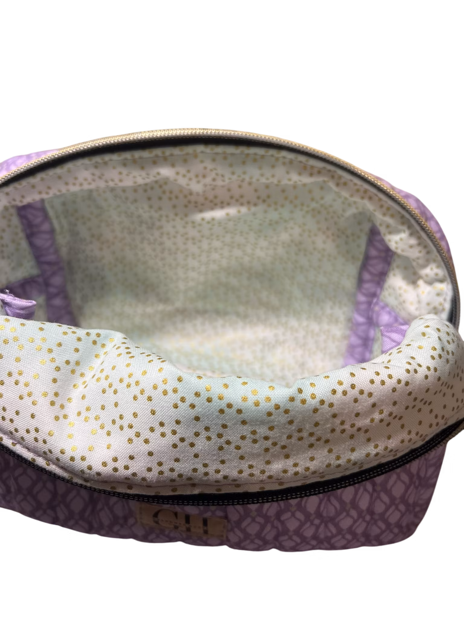 21 x 13 x 13 cm fodrad med guldprickigt tyg. vadderad. och snygg dragkedja med guldfärgat spänne