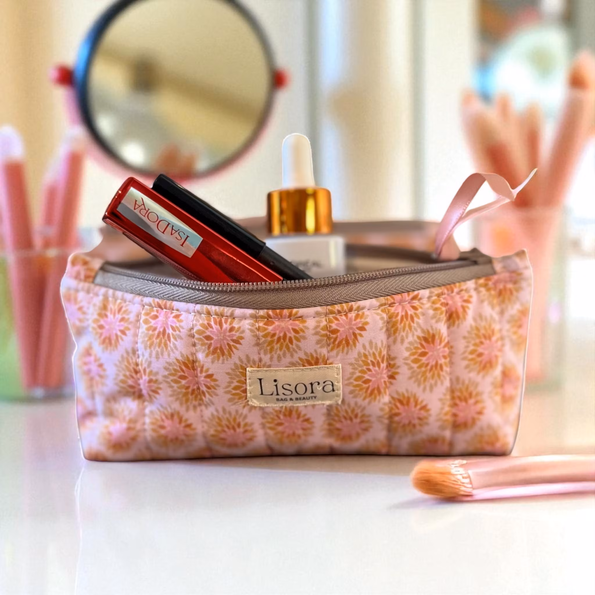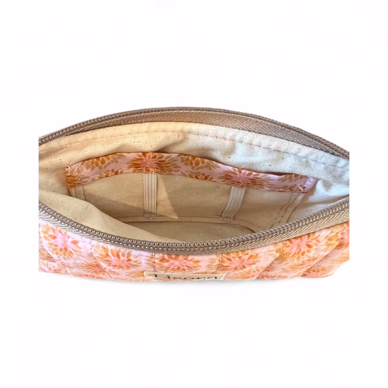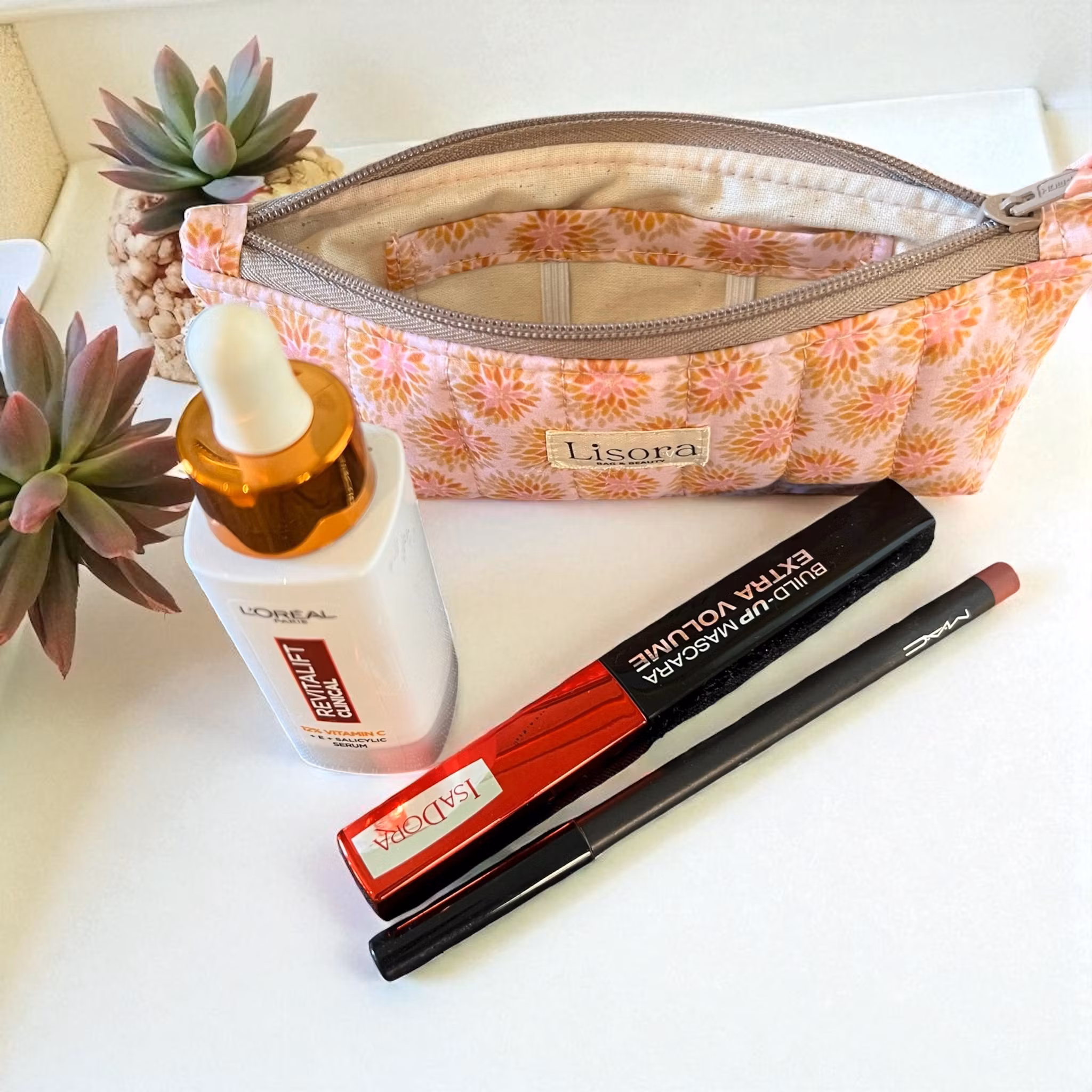 Söt necessär som är fodrad och vadderad. på insidan finns det en liten ficka och snoddar som kan användas för att hålla sminkpenna eller virknålar och liknande.