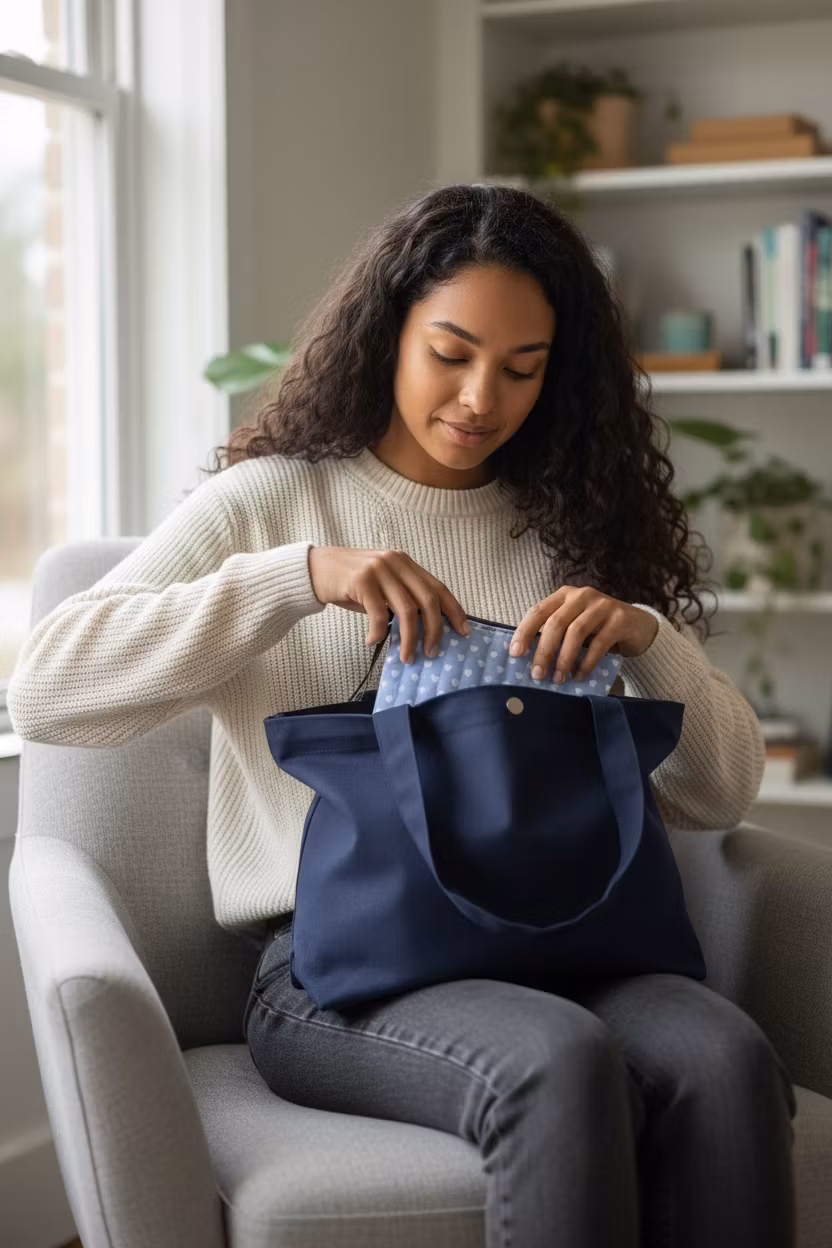 Söt plattare necessär med hjärtan. Necessären är vadderad och fodrad med ett ljust tyg.